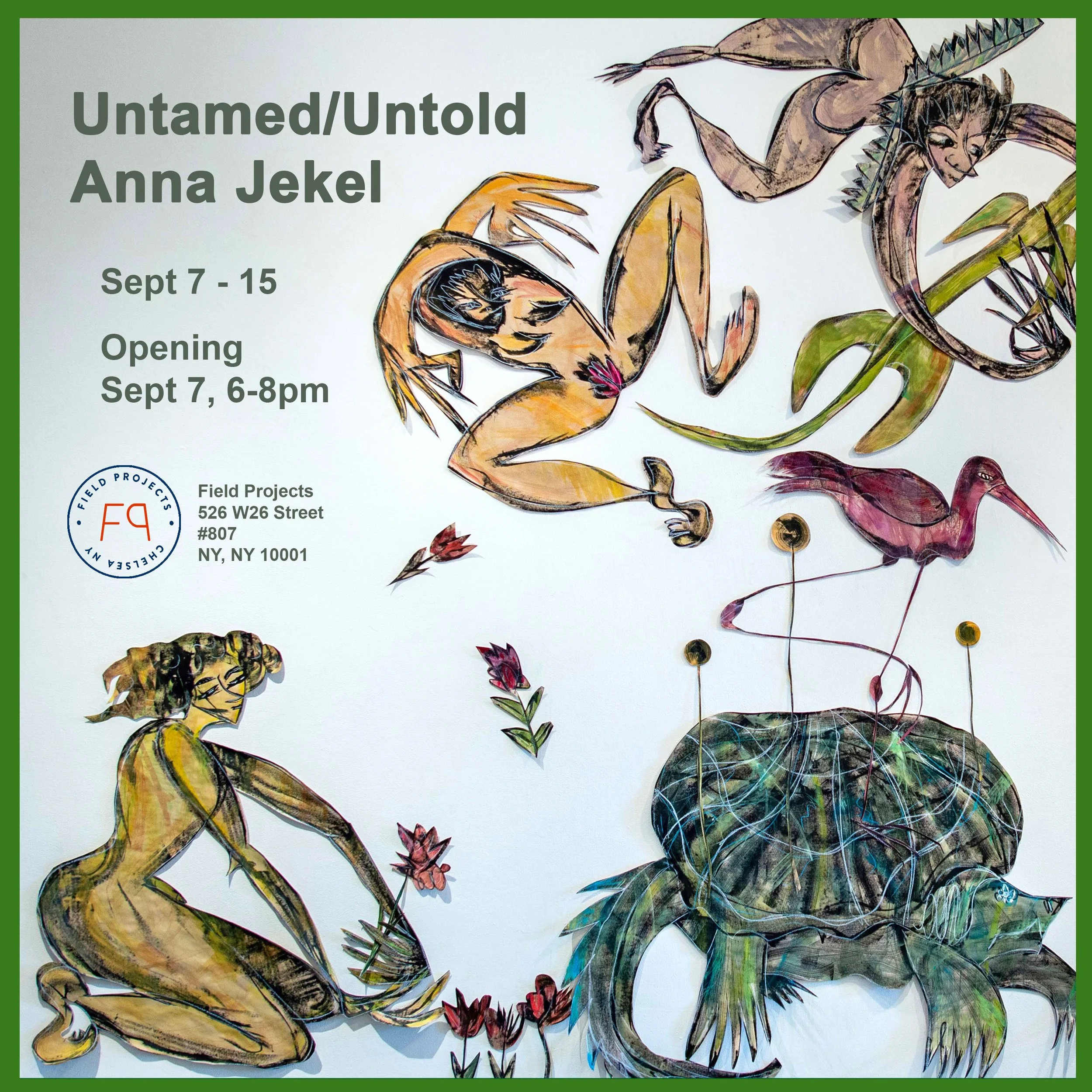 Field Projects is pleased to present Untamed/Untold, a solo exhibition of work by Anna Jekel, featuring large-scale painted paper cut-outs that occupy the walls and tell mystical, delightful, and sinister stories. The cut-outs are modern-day cave paintings that delve into a place where the hierarchies between plants, animals, and humans have dissolved and a primal freedom has emerged. And like the magical walls of prehistoric artists, Untamed/Untold is Jekel’s own cave where she revels in the absurdity and beauty of her obsessions: gender, sexuality, desire, and connection. The use of toned paper lends a warmth and sensitivity to the inhabitants of Untamed/Untold, while the childlike qualities of cut paper, crayons, and colored pencils imbue the world with a fairytale innocence. Gouache and ink are used in addition to the colored pencils and crayons; for Jekel, this mixed media approach encourages play and exploration. The dichotomies of naïveté and maturity, nature and humanity, deeply influenced Jekel’s life and work. Her fascination with nature stemmed from her many years visiting and exploring the mountain forests of western Massachusetts. After moving to New York City, her life became enveloped with human connection, but the enchantment sparked as a child continued undiminished. Navigating these two modes of life has led Jekel to a vision of a world abundant in interconnectedness, as joyfully depicted in Untamed/Untold.