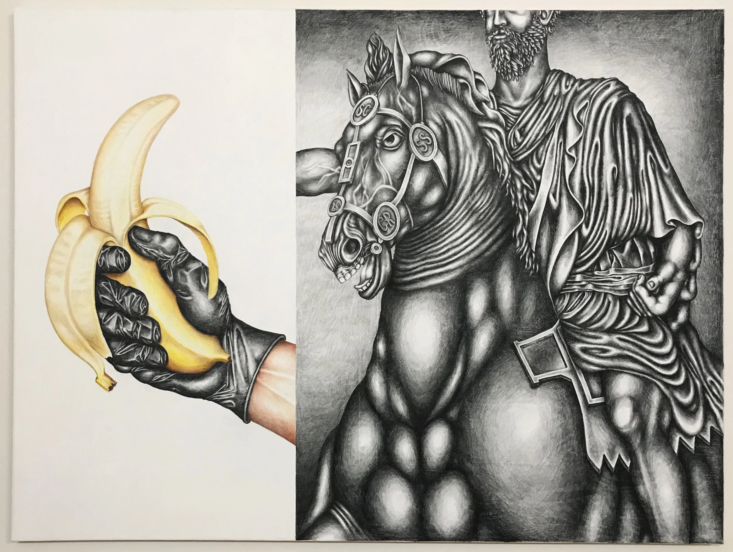 Featured: The History of Man, 2020, Colored pencil on canvas, 48 x 64”