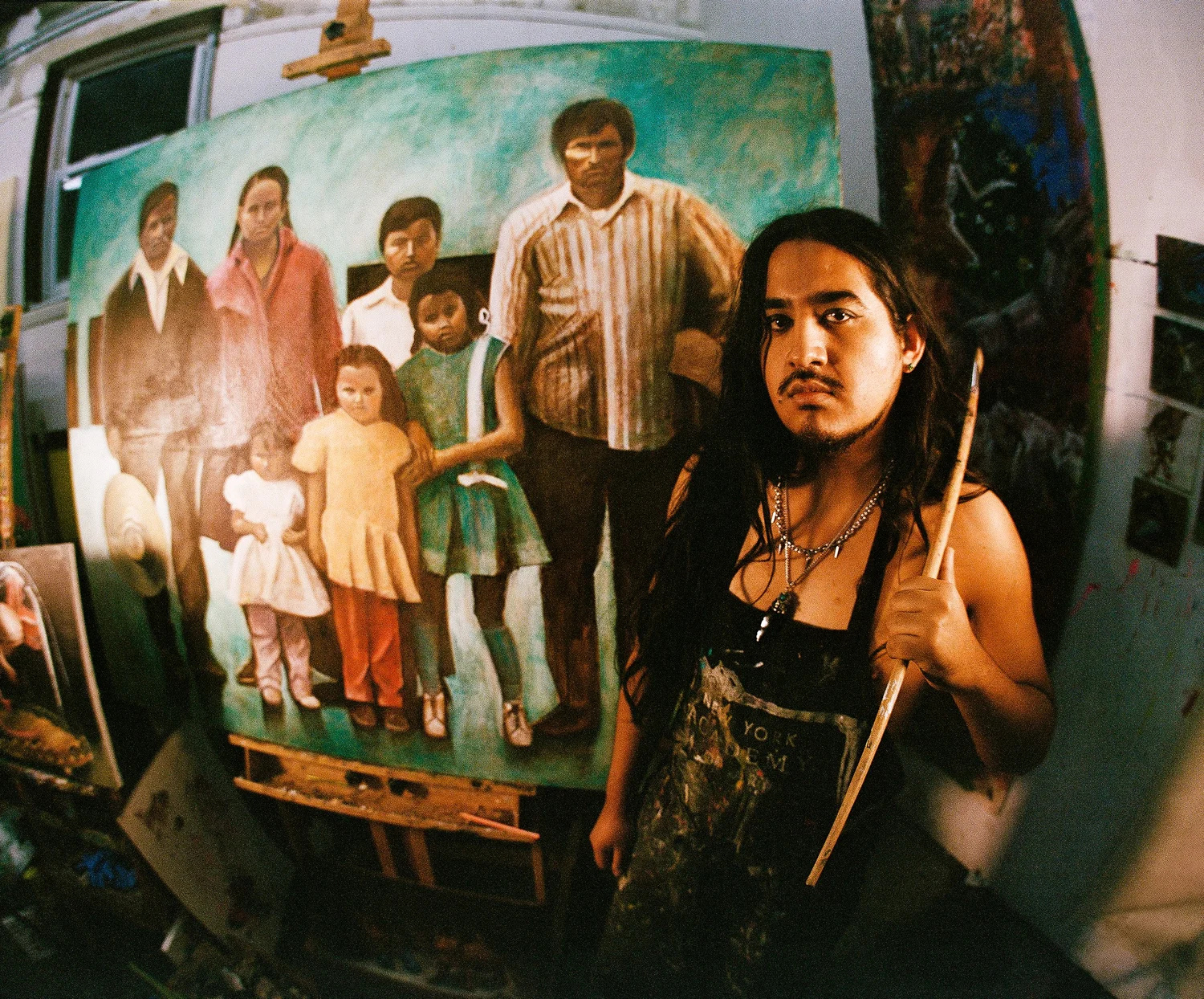 Manuel Hernandez is a painter born in Mexico City, currently based in New York City. He has held solo exhibitions at Gallery Poulsen in Copenhagen, Denmark, and at Mama Projects in New York City. His work has also been showcased at NADA Miami, ASU Art Museum, and 21c Museum. Hernandez shifts away from traditional square canvases to create shaped artworks. The unique forms of his pieces are inspired by the organic designs found in animal hide paintings, while their dimensions and textures echo the fresco murals of Teotihuacan. His artwork draws upon Mexica mythology and family oral history, presenting dreamlike memories that resonate with his personal experiences. As an immigrant in the U.S., he often felt compelled to suppress his Mexican and Indigenous heritage. Through his painting, he expresses his identity and creates discussions about displacement and erasure within his family and community.