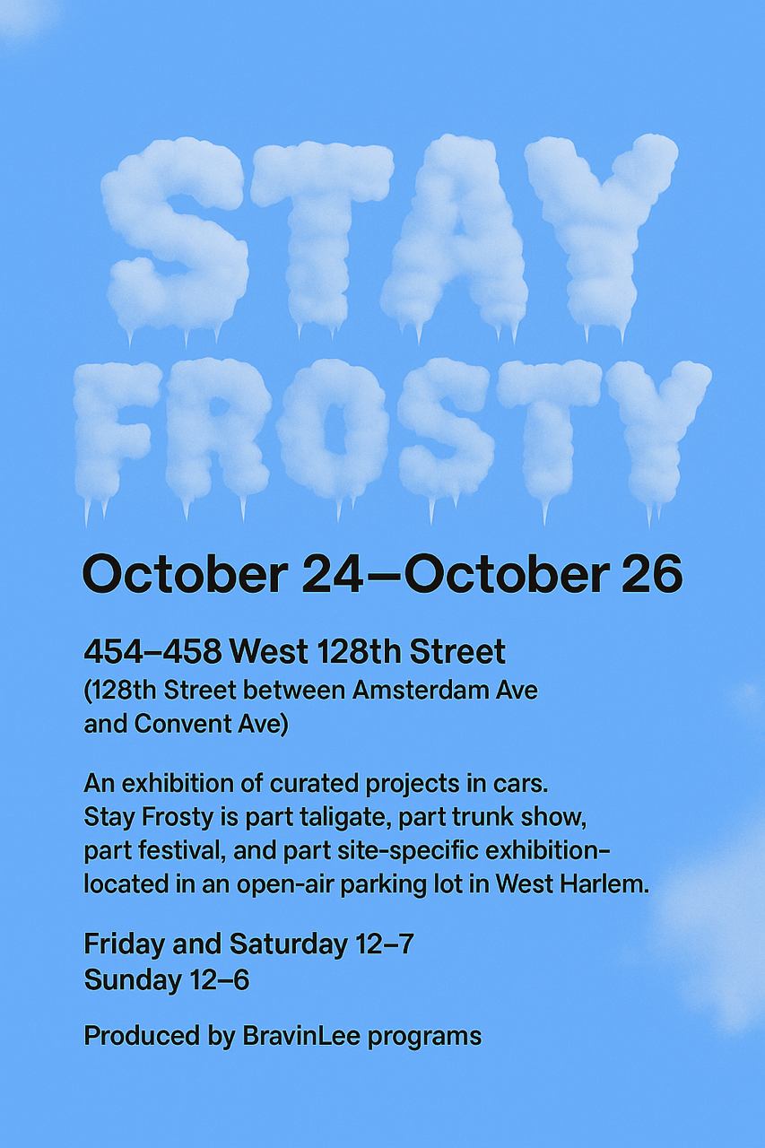 Stay Frosty is part tailgate, part trunk show, part festival, and part site-specific exhibition located in an open-air parking lot in West Harlem. Produced by BravinLee.